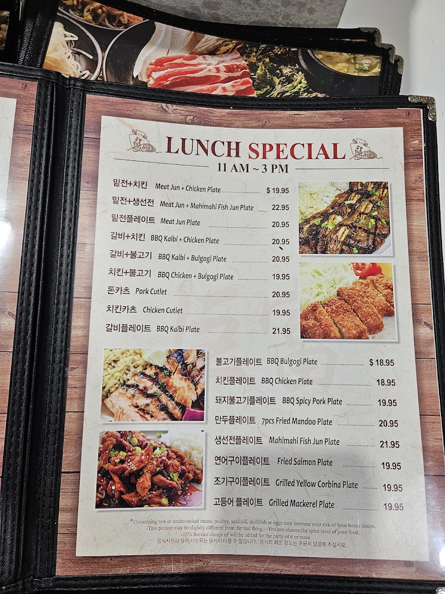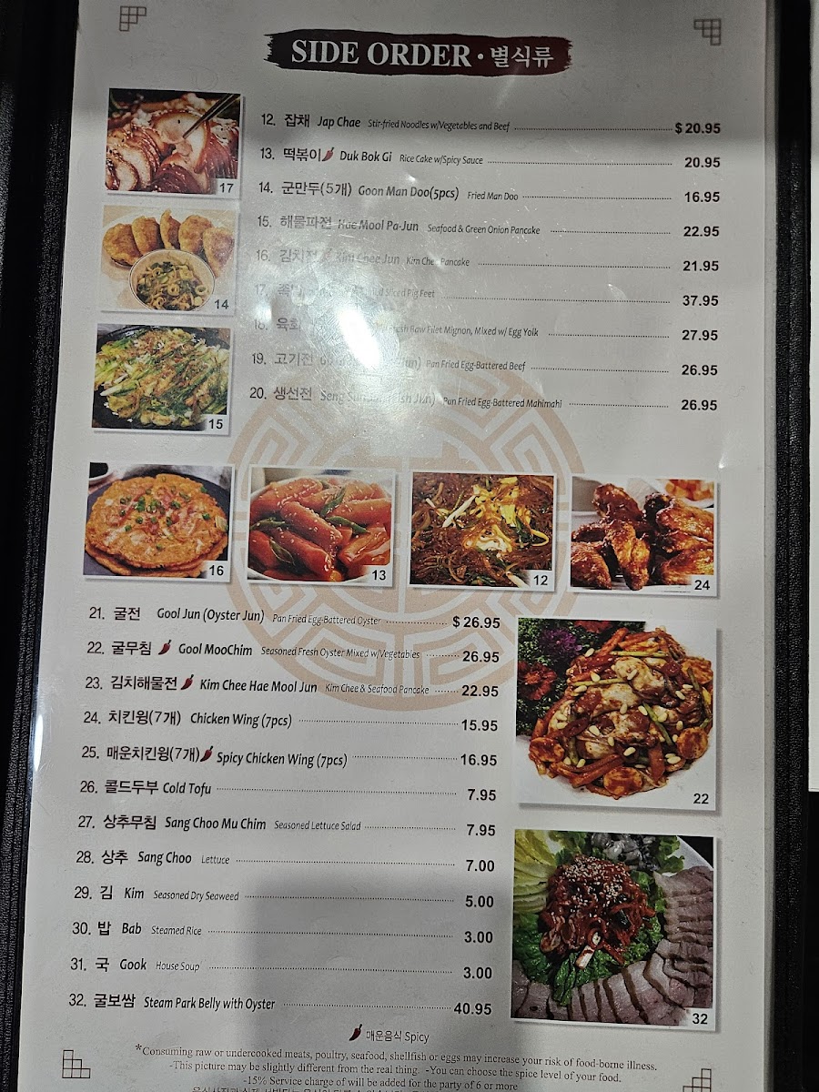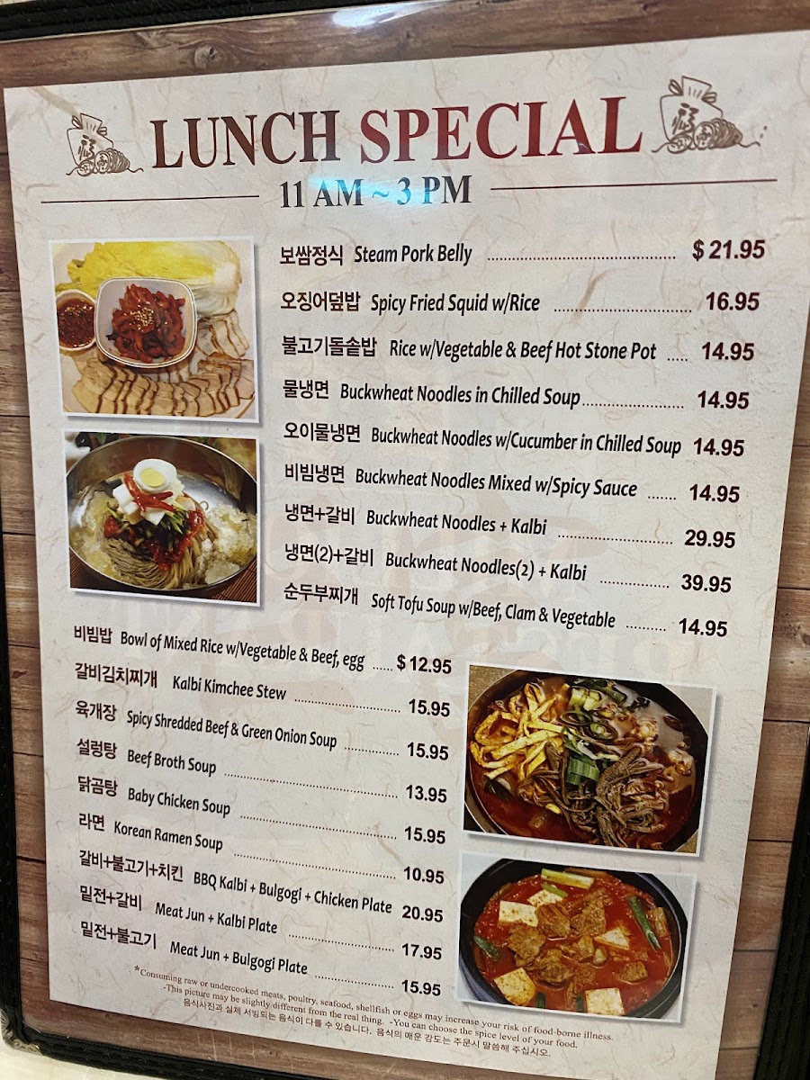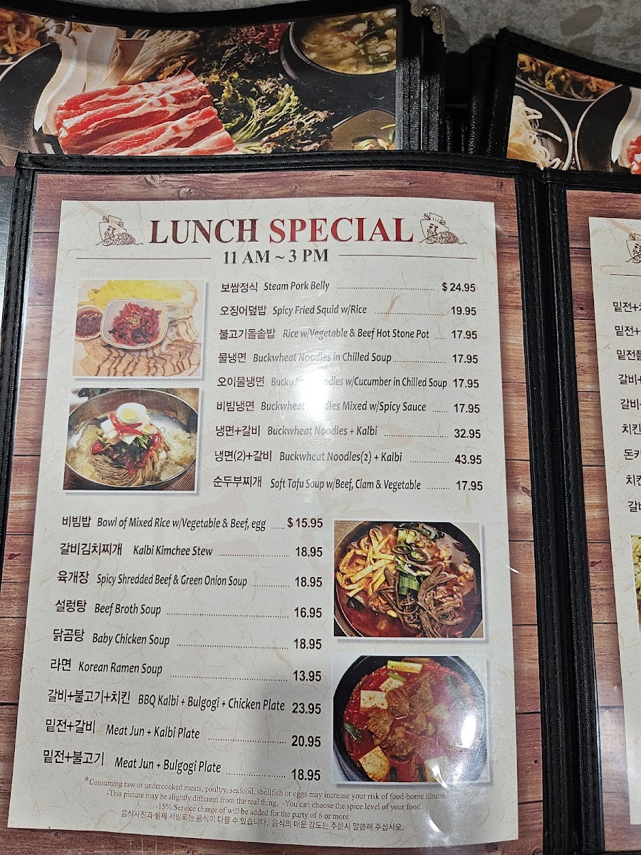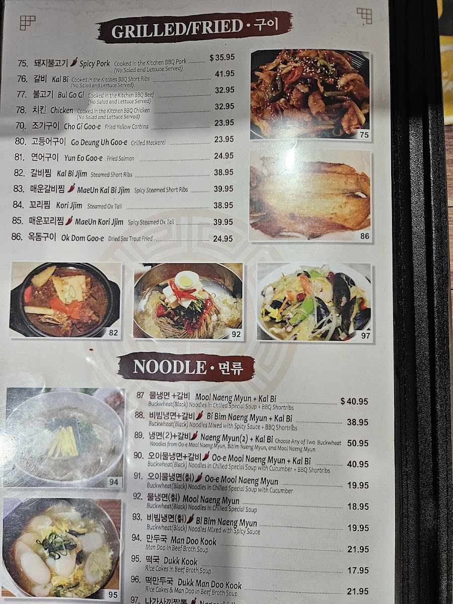 - Mool Naeng Myun - Chilled black buckwheat noodles served in a rich broth with BBQ shortribs for $28.95.